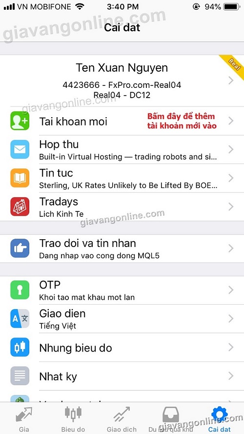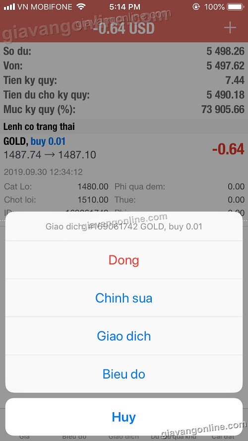 * Bạn bấm vào cặp ngoại tệ nào đó, ví dụ GOLD, sau đó chọn "Giao dịch" để vào lệnh