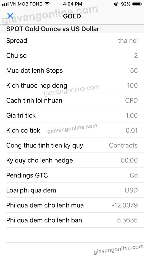 * Bạn còn có thể xem chi tiết thông tin 1 cặp tiền tệ, ví dụ ở đây là Gold (vàng), các thông số phí qua đêm, kích thước hợp đồng... bằng cách bấm vào Gold chọn "Chi tiết"