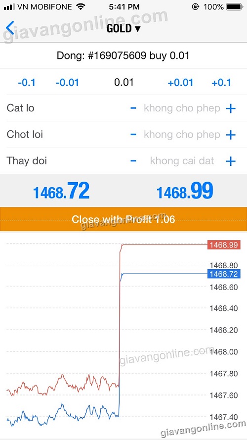 * Khi bấm đóng lệnh, màn hình sẽ hiện giá thị trường hiện tại và yêu cầu xác nhận: "Close with Profit" hoặc "Close with Loss" (đóng lệnh lời, hoặc đóng lệnh lỗ), bạn bấm vào là lệnh sẽ chốt