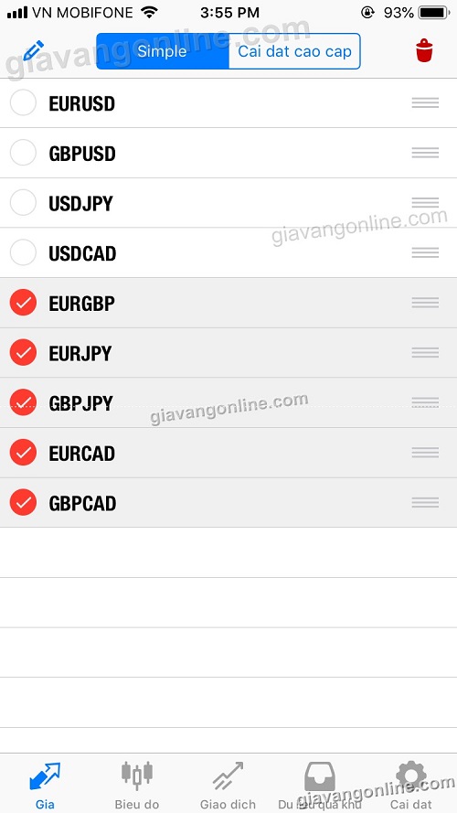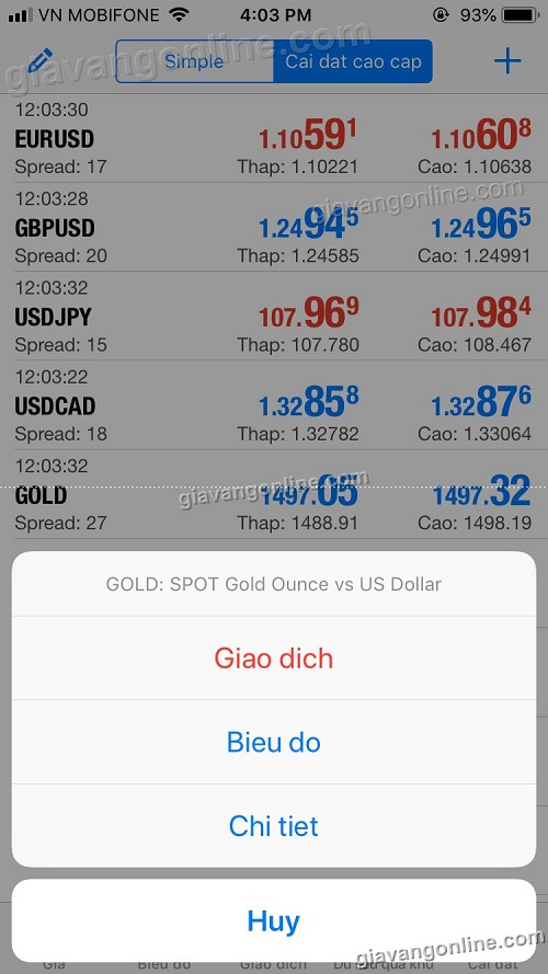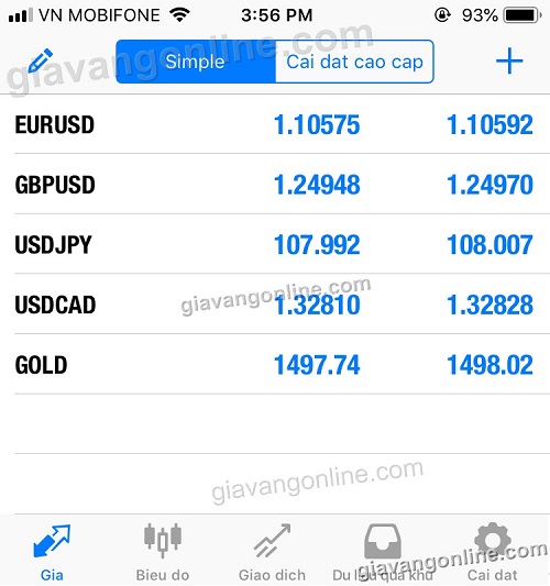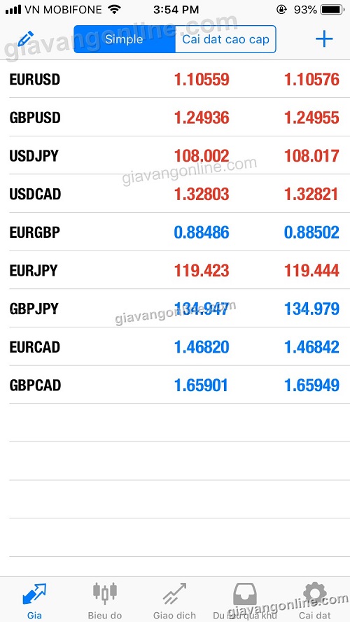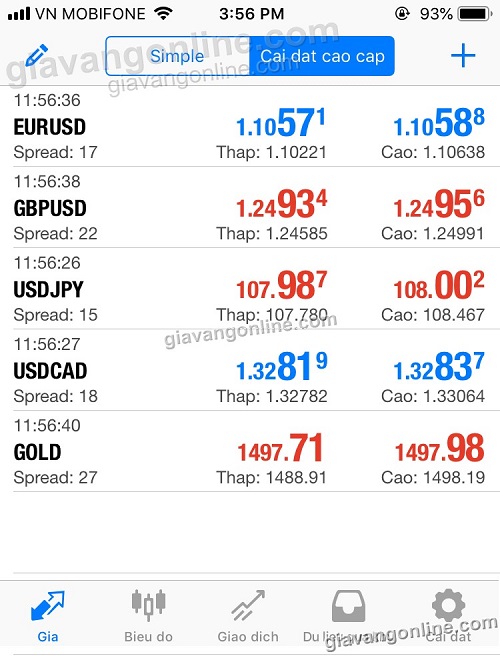 * Bạn có thể bấm "Cài đặt cấp cao" để biết được giá cao/giá thấp trong ngày với các cặp tiền tệ