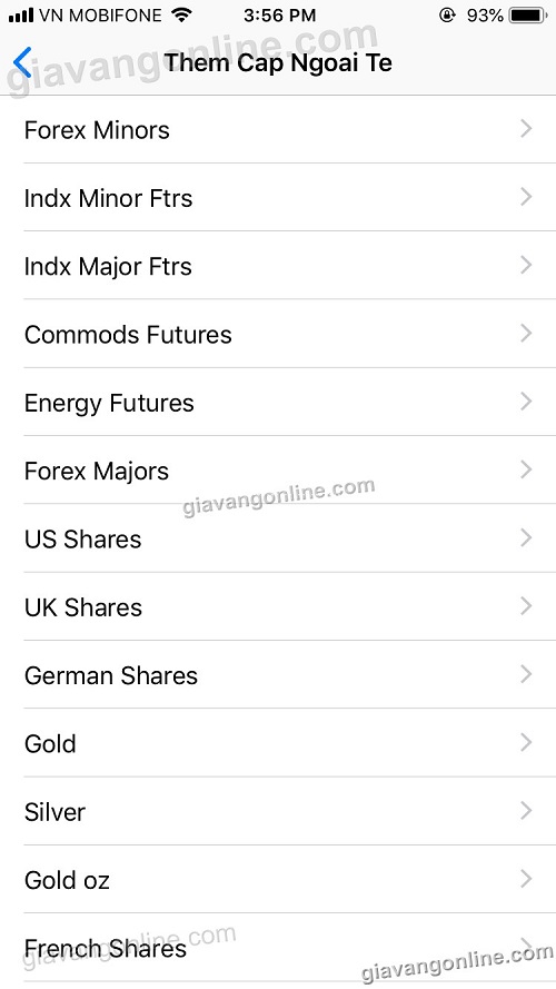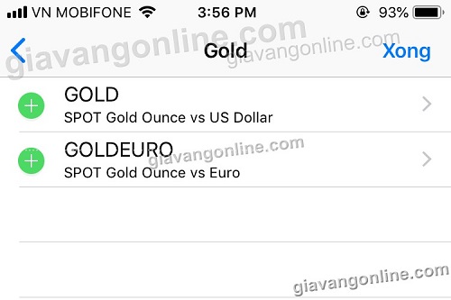 * Ví dụ ở đây bạn quan tâm tới Vàng (Gold), bạn bấm chọn Gold, sau đó bấm vào dấu cộng (+) màu xanh lá cây, và bấm nút "Xong" để hoàn tất hiển thị