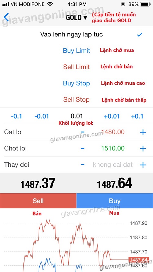 - Khối lượng 0.01 lot nằm chính giữa, bạn hãy để ý kỹ để không vào lệnh quá lớn (với Gold 1 lot = 100 ounce vàng, và 0.01 lot tương đương 1 ounce vàng)