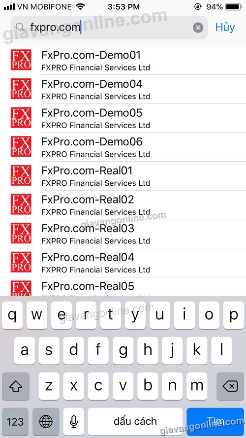 * Sau khi gõ Fxpro.com xong hệ thống sẽ liệt kê ra các máy chủ hiện có của cty Fxpro, bạn chọn 1 máy chủ đúng với tài khoản đã tạo