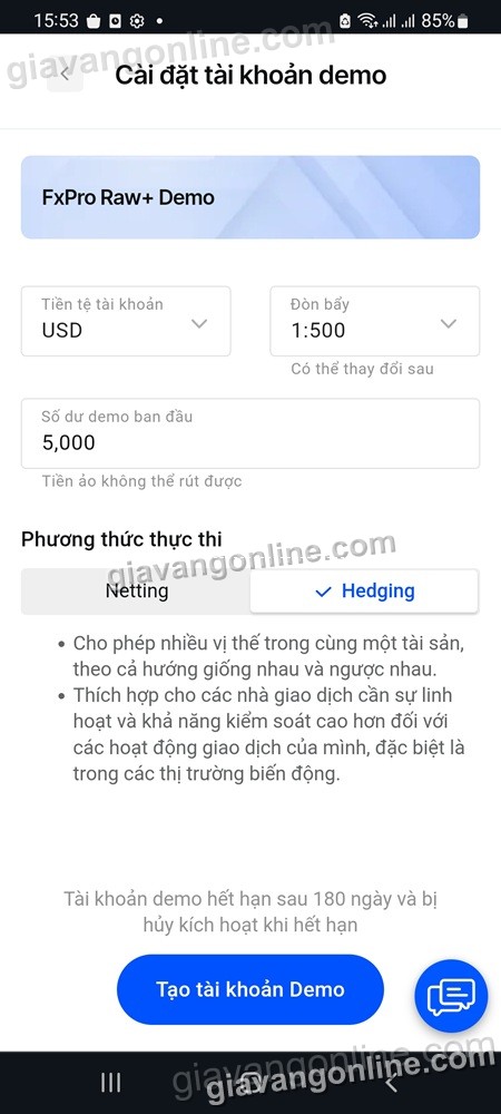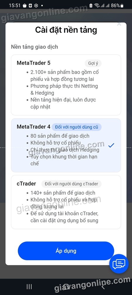 - Nền tảng: bạn nên chọn MT4 nếu giao dịch vàng & ngoại tệ, trường hợp giao dịch chứng khoán bạn phải chọn MT5 - Hedging