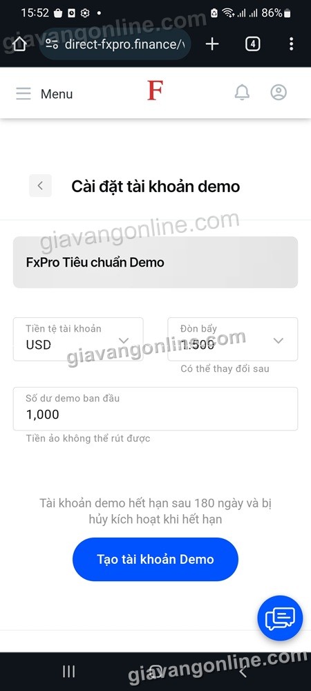 1. Đăng nhập vào https://direct-fxpro.finance/vi/login để tạo tài khoản giao dịch DEMO MT4/MT5 Fxpro