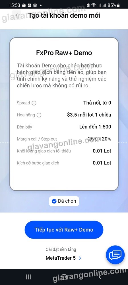 Khi bạn tạo tài khoản Demo thì mặc định là nền tảng Metatrader 5 - MT5 hiện ra, bạn bấm vào Tiếp tục với Raw+ Demo
