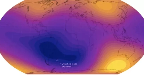 Điểm yếu trong từ trường Trái đất - khu vực phía trên Nam Đại Tây Dương, nơi cường độ từ trường thấp hơn đáng kể so với xung quanh - đã mở rộng diện tích gần bằng lục địa châu Âu trong 11 năm qua.